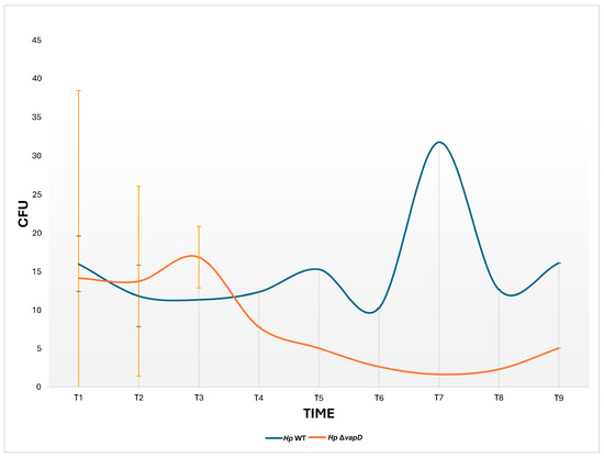 We also wanted to know if the vapD gene mutation would affect the survival of H. pylori inside gastric cells, so we performed parallel assays of both H. pylori 26695 strains (wt and HpΔvapD) in co-culture with AGS cells, which were maintained up to 108 h (t9). A CFU count from each co-culture was determined from the intracellular niche.