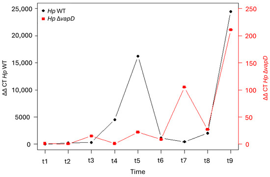 However, when the intracellular transcription levels of the vacA gene from H. pylori 26695 wt was compared with the HpΔvapD strain (taking the transcription level of the endogenous bacterial gene 16s as a reference value), we observed that the vacA gene from H. pylori 26695 wt had very high transcription levels in comparison to vacA from the HpΔvapD strain (Figure 4, Table S2). In the H. pylori wt strain, vacA was transcribed up to 10,000-fold higher than vacA from the HpΔvapD strain, with a significant difference of p = 0.005 (Figure 4, Table S3). This suggests metabolic impairment of vapD-mutated H. pylori within the intracellular environment.