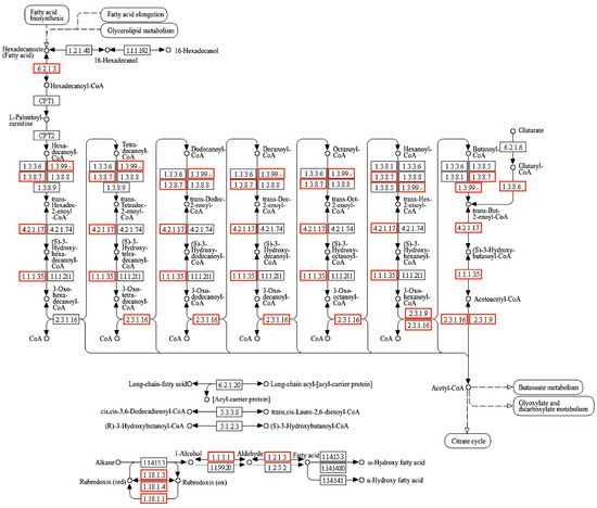 Metabolic pathway of putative strain A. calcoaceticus 21# to medium chain alkanes. The red box indicates that the genome of A. calcoaceticus 21# contains genes.