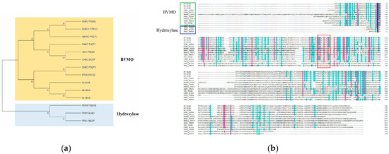Phylogenetic and sequence analysis of AlmA homologs. (a) Phylogenetic evolutionary tree of AlmA and its homologous proteins. (b) Multiple sequence comparison of AlmA and its homologous proteins. Note: The red box highlights characteristic motifs confirming classification of the target protein within the Baeyer-Villiger monooxygenase family.