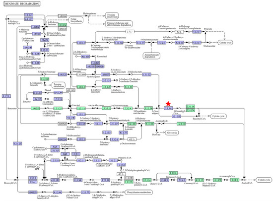 Genes implicated in aromatic hydrocarbon degradation in A. calcoaceticus 21# are cataloged in Table 3. For instance, the benABC gene cluster encodes benzoate 1,2-dioxygenase, which converts benzoate to 2-hydro-1,2-dihydroxybenzoate (DHB). DHB is further oxidized to catechol by 1,2-dihydrodihydroxybenzoate dehydrogenase (encoded by benD) [31]. The catA-catC operon facilitates ortho-cleavage of catechol to β-ketoadipate enol-lactone [32]. β-Ketoadipate enol-lactone is hydrolyzed to β-ketoadipate by muconolactone hydrolase (encoded by pcaD) [33], which is subsequently metabolized to succinyl-CoA and acetyl-CoA via β-ketoadipate CoA-transferase (FadA) and β-ketoadipyl-CoA thiolase (PcaF), respectively, for TCA cycle entry [34]. During gene mining, catechol 1,2-dioxygenase, a key enzyme acting on the rate-limiting step of aromatic hydrocarbon degradation, was identified. This enzyme may contribute to the high Pyr degradation capacity observed in A. calcoaceticus 21#. KEGG pathway analysis revealed that these genes also mediate the degradation of monocyclic aromatic pollutants, including p-aminobenzoate, 2-fluorobenzoate, chlorobenzene, toluene, xylene, nitrotoluene, and ethylbenzene. The benzoate degradation pathway in A. calcoaceticus 21# is schematically summarized in Figure 3.