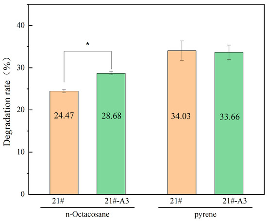 This study evaluated the hydrocarbon degradation capacity of Acinetobacter calcoaceticus and simultaneously investigated the impact of exogenous gene introduction on the degradation performance of the native strain. The engineered strain 21#-A3 showed a statistically significant increase in n-Octacosane degradation (28.68% vs. 24.47% in wild-type; p < 0.05), while Pyr degradation remained comparable (34.03% vs. 33.92%; not significant), which can be attributed to the integration of the av-almA gene from A. vivianii KJ-1, which up-regulated alkane catabolism. The pyrene degradation capacity remained statistically unchanged in the engineered strain 21#A3 compared to the parental strain. This demonstrates that integration of the exogenous long-chain alkane degradation gene almA neither significantly perturbed native catabolic gene expression nor enhanced aromatic metabolism, revealing functional compartmentalization between alkane and PAH degradation pathways (Figure 4).