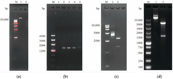 (a) Electropherogram of A. vivianii KJ-1 genomic DNA; (b) PCR products of av-almA-BH; (c) enzymatic verification; (d) double digestion identification of recombinant pET-28a(+)-av-almA-BH plasmid. Note: (a) M indicates the DNA marker, 1 indicates the extracted genomic DNA of KJ-1. (b) 1 indicates the negative control, where ddH2O was used as the template. 2–5 indicate the PCR amplification products at annealing temperatures of 58 °C, 60 °C, 62 °C, and 64 °C. (c) 1 indicates the pLB-av-almA-BH cloning vector, 2 indicates the restriction digestion results of pLB-av-almA-BH. (d) M indicates the DNA marker, 1 indicates the pET28a(+)-av-almA-BH plasmid carrier, and 2 indicates the result of enzyme digestion.