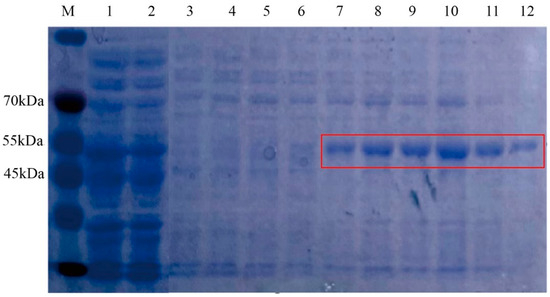 E. coli BL21(DE3)-av-almA-BH showed a distinct band near 55 kDa after 4 h of induction at 37 °C with 0.1 mM IPTG. This band was equal in size to the protein molecular weight prediction of 55.8 kDa, which was determined to be the target protein band (Figure S4). Subsequently, the affinity chromatography on a nickel column was used to purify the AlmA protein. The purification results are shown in Figure 6; lanes 7 to 12 are the purified proteins. Purified enzyme solutions were employed for enzyme activity determination. The purified enzyme condition can avoid the influence of coenzymes and non-target proteins contained in the protein solution. Therefore, the measured enzyme activity is more accurate, which gave a better understanding of the properties of the target proteins.