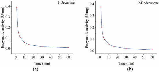 Enzymatic activity of AlmA on 2-decanone (a) and 2-dodecanone (b) at different times.