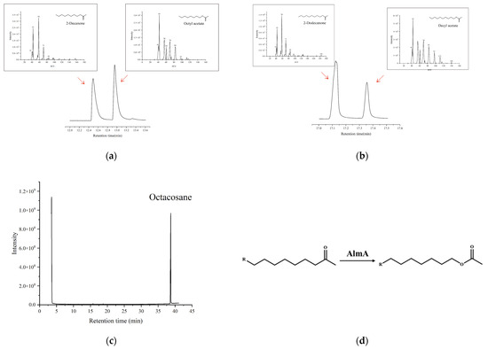GC-MS identification of metabolites of the enzymatic reaction of AlmA protein. (a) Chromatograms and mass spectra of 2-decanone and octyl acetate; (b) chromatograms and mass spectra of 2-dodecanone and decyl acetate; (c) chromatograms of n-Octacosane; (d) Baeyer–Villiger reaction of aliphatic ketones catalyzed by AlmA.