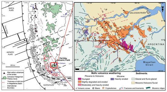 Regional map of Patagonia showing the distribution of basaltic rocks like the Pali Aike Volcanic Field. The inset shows the geological context of Laguna Timone (red square) in the Pali Aike Volcanic Field (source: adapted from [30,31,32]).