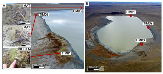 Location of the microbial samples around Laguna Timone. (A) The images show the locations of TIMO 1, TIMO 2, and TIMO 3 on the margin of the lake. (B) The drone image shows the spatial locations of the samples around the crater lake.