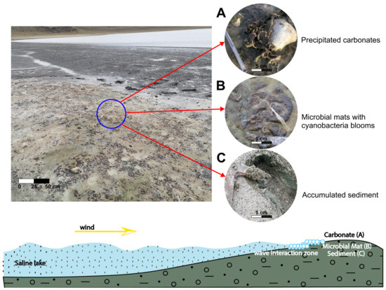 The images show microbial mats developed on sediments that are partially covered with carbonate precipitates on the margin of the crater lake, where the microbial mats are above the sediments and below the carbonate precipitated. The schematic model of Laguna Timone illustrates where the microbial system develops along the margin of crater lake. There is wave action zone that reworks the observed microbial mats, and prompts a mixture of all components of the system. The blue circle encompasses the locations of the images in the scheme representing the (A) carbonates, (B) microbial mats, and (C) sediment.