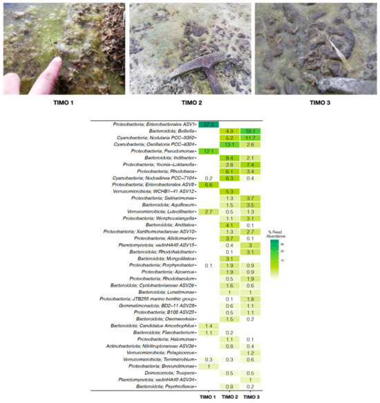 The genetic analysis revealed distinct taxonomic profiles across the three sampling sites (Figure 4). TIMO 1 was dominated by the phyla Proteobacteria and Bacteroidota, with Enterobacterales ASV1 (~37%) and Pseudomonas (~12%) as the most abundant genera. Other lower-abundance taxa included Enterobacterales ASV8 (~6%), Luteolibacter (~3%), Candidatus Amoebophilus (1.4%), Flavobacterium (1%), and Brevundimonas (1%). Other taxa, such as Terrimicrobium, Nodosilinea, and Porphyrobacter, were present at relative abundances below 1%. TIMO 2 was dominated by the phyla Bacteroidota, Proteobacyeria and Cyanobacteria, with Oscillatoria (~13%), Indibacter (~8%), Nodosilinea (6.3%), Rhodobaca (~6%), WCHB1-41 ASV12 (~5%), Nodularia (~5.2%), and Belliella (~5%) as the most abundant genera. TIMO 3 was also dominated by the phyla Bacteroidota, Proteobacteria, and Cyanobacteria, with its dominant genera including Belliella (~18%), Nodularia (~11%), and Loktanella (~7%). Phylum- and family-level summaries have been included in the Supplementary Material (Figures S1 and S2).