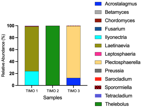 Genus-level fungal composition in the TIMO 1–3 samples based on ITS sequencing. TIMO 1 was dominated by Laetinaevia (~75%) and Ilyonectria (~24%), TIMO 2 by Thelebolus (~99.9%), and TIMO 3 by Plectosphaerella (~87%) and Acrostalagmus (~12.5%). Additional low-abundance genera were also detected at each site.