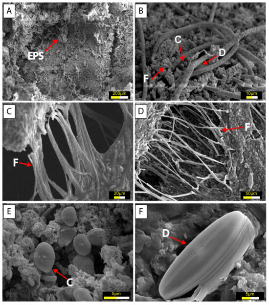 SEM images of the microbial mats samples: (A) EPS matrix associated with filamentous cyanobacteria and diatom (TIMO 2); (B,C) cyanobacteria filaments (TIMO 2); (D) filamentous structures interconnected, forming ramifications (TIMO 3); (E) coccoid bacteria (TIMO 3); and (F) diatom frustules (TIMO 3). Coccoid bacteria (C), Diatoms (D), Filamentous structures (F).