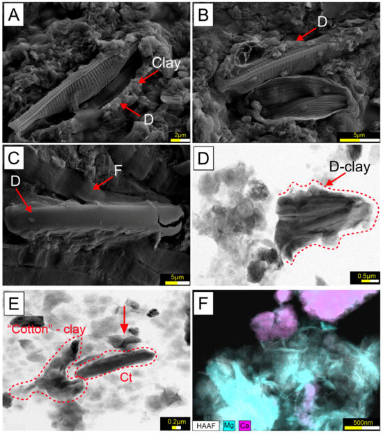 (A–C) SEM images from TIMO 2 show diatoms’ frustules broken and coated by clay particles; HRTEM images indicate (D) the clay coatings on diatom structures and (E,F) the Mg–clay “coatings” associated with the elongate carbonate crystals (indicated by arrow). Calcite (Ct), Diatoms (D), Filamentous structures (F).