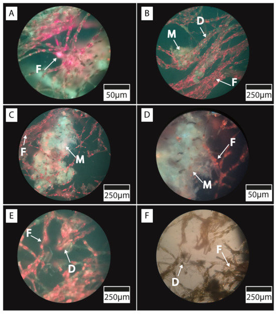 Fluorescence microscope images of microbial mats: (A) TIMO 2 sample showing filaments (red fluorescence); (B–D) filaments, probably from cyanobacteria, associated with mineral aggregates and diatoms (TIMO 2); and (E,F) TIMO 3 sample also showing a clear relationship between microorganisms and aggregates of calcite. Filaments (F), Mineral aggregates (M), Diatoms (D).