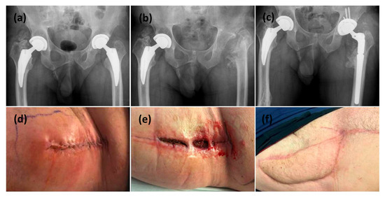 This is a figure of left hip PJI with all revisions performed through a posterior surgical approach. (a,d) radiographic and clinical presentation with initial symptoms of PJI, (b) The patient underwent a stage-1 revision with an antibiotic-cement spacer, (e) wound dehiscence at 4 weeks post spacer implantation, (c,f) The spacer was then revised to Stage-2 definitive implant with a VRAM flap at the same time.