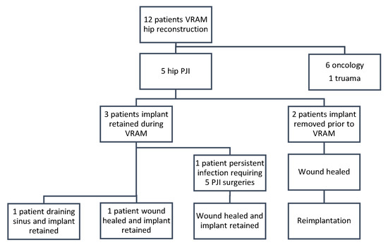 Muscle flap coverage plays a crucial role in managing persistent PJI with soft tissue defects. Both local and free muscle flaps have been utilized, each with distinct advantages and limitations [9,13]. The VRAM flap is a highly versatile reconstructive option that has been successfully employed to address soft tissue defects in a wide range of anatomical regions [9]. However, its application in managing PJIs of the hip has not been previously described in the literature. This study aims to evaluate the effectiveness of VRAM flaps in managing complex, persistent polymicrobial PJIs of the hip, with a focus on wound healing and infection control following VRAM flap reconstruction. We propose that VRAM flaps offer a superior alternative, combining the coverage benefits of free flaps with the reliability and lower failure rates of local flaps. Their robust vascularity, reduced morbidity, and ability to maintain function make them an effective solution for complex hip PJI cases [14,15,16]. Despite the versatility of VRAM flaps, research investigating their specific safety and outcomes following persistent hip PJIs remains limited.
