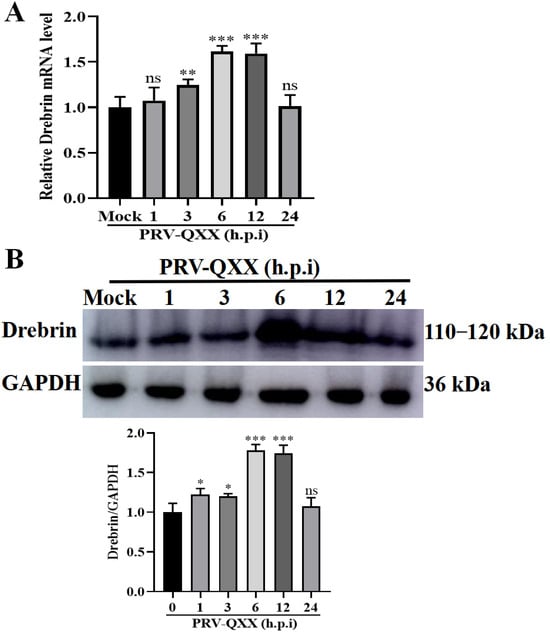 Expression of Drebrin response to PRV infection. PK−15 cells were infected with PRV-QXX (MOI = 1) for indicated times. Drebrin mRNA and protein levels were evaluated via qRT-PCR (A) and Western blot (B), respectively. GAPDH was used as the loading control. Gray value analysis using ImageJ. Significance levels relative to the corresponding control were denoted as non-significant (ns) for p > 0.05, * p < 0.05, ** p < 0.01, and *** p < 0.001.