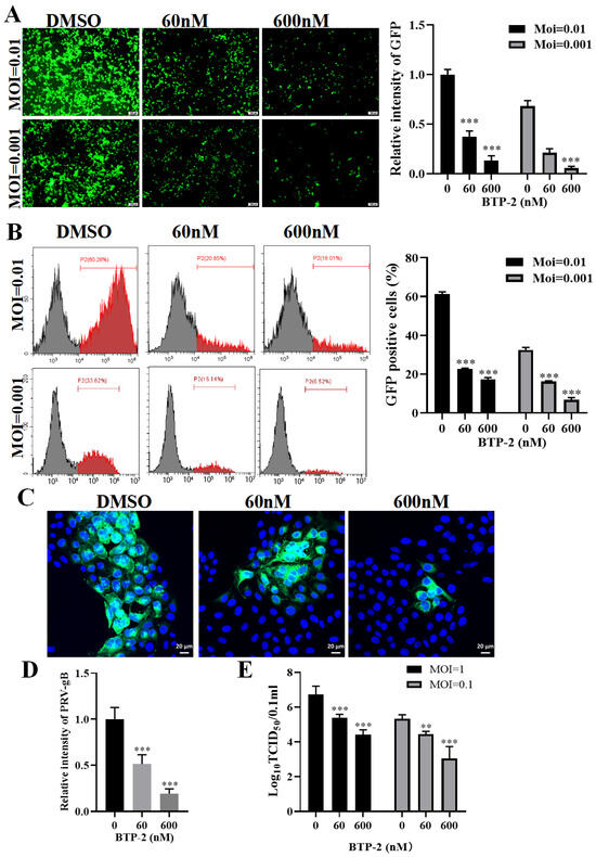 To assess the roles of Drebrin in PRV proliferation, we firstly explored the effect of the Drebrin inhibitor BTP−2 on PRV proliferation in PK−15 cells. PK−15 cells were first incubated with the indicated concentration of BTP−2 for 4 h, infected with PRV-GFP at different MOIs, and then incubated with the same concentration of BTP−2 for 24 h, followed by fluorescent microscope (Figure 2A) and flow cytometry (Figure 2B) analysis. Compared with control cells, BTP−2-treated cells exhibited significantly reduced PRV-GFP infectivity, as evidenced by both diminished GFP signal intensity (p < 0.001) (Figure 2A) and a reduced percentage of GFP-positive cells (p < 0.001) (Figure 2B). The inhibitory effect of BTP−2 on PRV-GFP infection gradually strengthened with the decrease in infection dose. To further characterize BTP−2’s antiviral activity, we assessed its impact on PRV-QXX replication using IFA and viral titration assays. IFA revealed a dose-dependent suppression of viral protein gB expression (Figure 2C,D). Viral titration by TCID50 assay confirmed this inhibitory effect, demonstrating a progressive decline in progeny virion production with increasing BTP−2 concentrations (Figure 2E). These results showed that BTP−2 inhibited PRV infection in a dose-dependent manner.