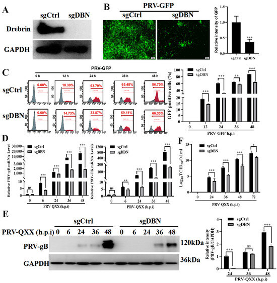 Knockout of Drebrin inhibited PRV replication. (A) The Drebrin knockout cell line was constructed, and the efficiency of knockout was assayed by Western blot. GAPDH was used as the loading control. (B) The sgCtrl and sgDBN cells were infected with PRV−GFP (MOI = 0.01) for 24 h; then, the cells were observed under a fluorescence microscope, and the fluorescence intensity of GFP was measured by ImageJ. Scale bar, 200 μm. (C) sgCtrl and sgDBN cells were infected with PRV-GFP (MOI = 0.01) for indicated times, and the GFP-positive cells were measured by flow cytometry. (D) The sgCtrl and sgDBN cells were infected with PRV-QXX (MOI = 1) for indicated times, and the PRV-gB and PRV-TK genes level were determined by RT-qPCR. (E) The sgCtrl and sgDBN cells were treated as in (D), and then the cells were collected and subjected to Western blot for the analysis of PRV-gB levels. GAPDH served as the loading control. (F) The sgCtrl and sgDBN cells were infected with PRV-QXX (MOI = 1) for different times, the viruses were harvested with three freeze–thaw cycles, and then the viral titers were analyzed by TCID50 assay. Significance levels relative to the corresponding control were denoted as non-significant (ns) for p > 0.05, * p < 0.05, ** p < 0.01, and *** p < 0.001.