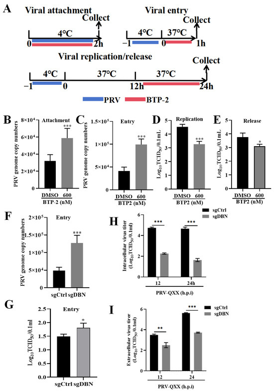 For viral entry assays, PK−15 cells were firstly incubated with PRV-QXX (MOI = 10) at 4 °C for 1 h to allow virus adsorption. Subsequently, the unbound virus was removed, and medium containing 600 nM BTP−2 was added. Cells were incubated at 37 °C for another hour to allow viral entry; then, cells were washed to remove the residual virions on the plasma membrane, and viral entry was detected by qRT-PCR analysis of viral genome copy numbers. In addition, the sgDBN and sgDBN cells were incubated with PRV-QXX (MOI = 10) at 4 °C for 1 h to allow virus adsorption. The unbound virus was removed, cells were incubated at 37 °C for another 1 h to allow viral entry, and then cells were washed to remove the residual virions on the plasma membrane. Finally, viral entry was evaluated by qRT-PCR and TCID50.