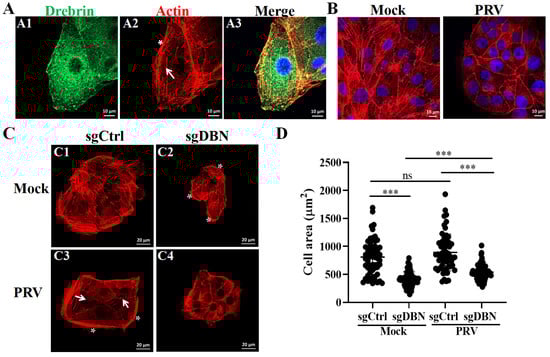 Not surprisingly, viruses have developed strategies to reorganize the actin cytoskeleton to successfully infect host cells. The dynamics change in actin, and its functions are regulated by multiple actin-binding proteins in virus infection. In a previous study, using the compound library targeting actin and actin-associated proteins, our group showed that the actin cytoskeleton played essential roles in PRV infection [26]. Herein, we found that PRV infection induced the rearrangement of the actin cytoskeleton, the actin stress fibers were disrupted, and actin accumulated more at the periphery of cell membranes (Figure 5B). In addition, we wondered if Drebrin affects the dynamic changes in the actin cytoskeleton during PRV infection. To this aim, sgCtrl and sgDBN cells were infected with PRV-QXX and then subjected to IFA assay for observing the morphology of the actin cytoskeleton. Uninfected control cells were used as the control (mock). As shown in Figure 5(C1), the actin diffused in the cytoplasm and formed stress fibers and dorsal actin bundles (Figure 5(C1)), which was consistent with the localization pattern in PK−15 cells (Figure 5(A2)). Compared with the control cells, PRV infection induced the rearrangement of the actin cytoskeleton, the formation of stress fibers was partially disrupted, actin-based spiky protrusions (arrowheads) were generated at the edge of cells, and there were thick dorsal actin bundles at the outer rim of the cell population (asterisk) (Figure 5(C3)). In addition, we found that the area of cells infected with PRV were bigger than the mock cells, but the difference did not reach statistical significance (Figure 5D).
