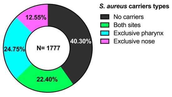 The most studied niche of S. aureus in humans is the nose, with reported incidences of 20–80% [5], but it also colonizes other anatomical sites in varying percentages, such as the intestines (17–31%), vagina (22%), perineum (22%), abdomen (15%), and axillae (8%) [6,7,8]. However, another important site is the pharynx, which presents variability in the colonization percentage with reports from 4% to 75% [9], and pharyngeal colonization may even be higher than nasal colonization in studies where nasal and pharyngeal samples are taken at the same time [5,6,10,11,12,13].