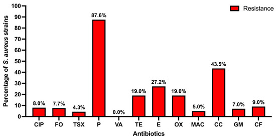 Regarding antibiotic resistance, it was found that 87.60% of the strains are resistant to penicillin, in second place 43.37% of the strains presented resistance to clindamycin, while the third antibiotic with the highest resistance was erythromycin (27.24%). Following that, 19% were resistant to oxacillin and tetracycline, the other antibiotics presented less than 10% of resistant strains, and no strains resistant to vancomycin were found; these results are presented in Figure 2.