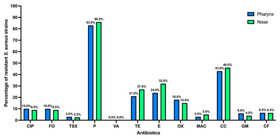 Antibiotic resistance of S. aureus strains isolated from the pharynx and nose. Ciprofloxacin (CIP), fosfomycin (FO), trimethoprim-sulfamethoxazole (TSX), penicillin (P), vancomycin (VA), tetracycline (TE), erythromycin (E), oxacillin (OX), nitrofurans (MAC), clindamycin (CC), gentamicin (GM), and cephalothin (CF).
