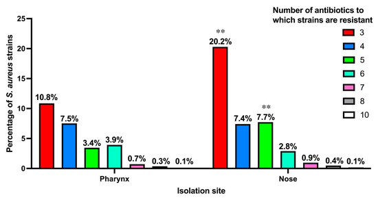 Number of antibiotics to which S. aureus strains are resistant. ** p < 0.01.
