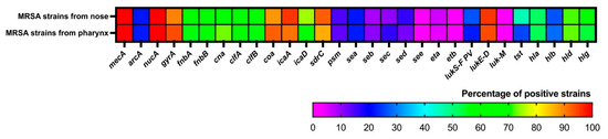 The results of the presence of virulence factor genes amplified by PCR from MRSA isolated from the pharynx and nose are presented in Figure 6 and Supplementary Table S2. It is observed that the most prevalent genes are mecA, lukE-D, icaA, sdrC, coa, and gyrA, which are present in at least 90% of MRSA. The genes nucA, fnbA, fnbB, cna, clfA, clfB, icaD, sdrC, gyrA, coa, hla, hld, hlg, and tst were found in between 25% and 90% of MRSA. While the genes with a presence of less than 25% are arcA, psm, lukS-PV/lukF-PV, the five enterotoxins (sea, seb, sec, sed, see), and the two exfoliative toxin genes (eta and etb). Only the luk-M gene is not present in any of the strains, while the see gene was amplified in only one pharyngeal strain and was not amplified in nasal strains (Table S2).