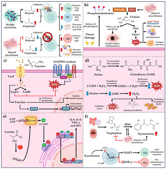 This effect is attributed to secondary taurine metabolism, which produces haloamines such as taurine chloramine (TauCl) and taurine bromamine (TauBr). These compounds inhibit oxidative stress by interacting with the NADPH complex and simultaneously upregulate transcription factors involved in intracellular antioxidant mechanisms, such as Nrf2 (Figure 1c) [44]. These findings highlight the essential role of taurine in maintaining ocular tissue integrity. Nevertheless, the evidence is somewhat contradictory as elevated levels of taurine have been detected in the tears of patients with pSS. This increase may reflect a compensatory mechanism, wherein taurine metabolism is upregulated to mitigate tissue damage, with ocular cells themselves acting as the primary source of taurine rather than the local microbiome [36,44].