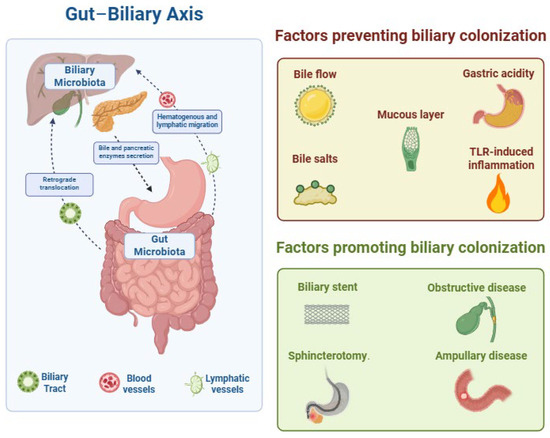 Gut–biliary axis: microbes can access the biliary tree via duodeno-biliary reflux and hematogenous or lymphatic translocation. Colonization is ordinarily restrained by antegrade bile flow, bactericidal bile salts, gastric acidity, the biliary mucous layer, and TLR-mediated epithelial immunity. Disruption of these defenses—by biliary stenting or endoscopic sphincterotomy, and in the context of biliary obstruction or ampullary disease—facilitates biliary colonization.