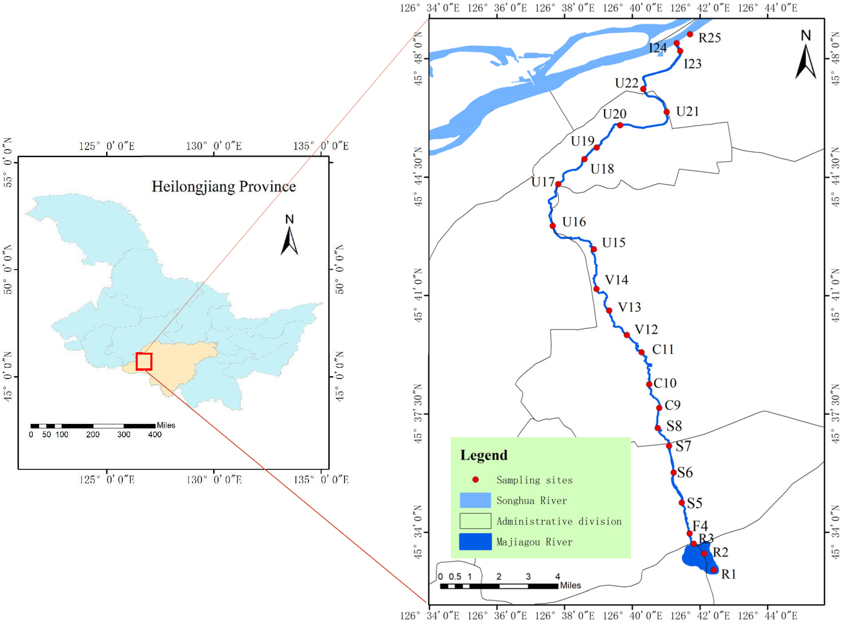 The Majiagou River (126°41′–126°43′ E, 45°32′–45°49′ N) is a first-order tributary located on the southern bank of the Songhua River. It originates in Wanghuiwen Village, Lixin Township, Acheng District, Harbin, and flows for a total length of 44.3 km, with 34.7 km running through the urban area. The upstream Gongnong Reservoir is a small-sized reservoir with a storage capacity of 3.1 million m3. It primarily functions as a water supply source for the urban river channel, while also serving roles in flood control, irrigation, fisheries, and tourism. The Majiagou River flows through key urban districts of Harbin, including Pingfang, Xiangfang, Nangang, Daoli, and Daowai, making it one of the most important inland rivers in this northeastern Chinese city. It represents a typical urban river system. Along its course from the source to the confluence with the Songhua River, the river traverses areas with diverse land use types, including rural, peri-urban, and urban landscapes. This diversity in topography and land use across the watershed contributes to significant environmental heterogeneity along different river sections.
