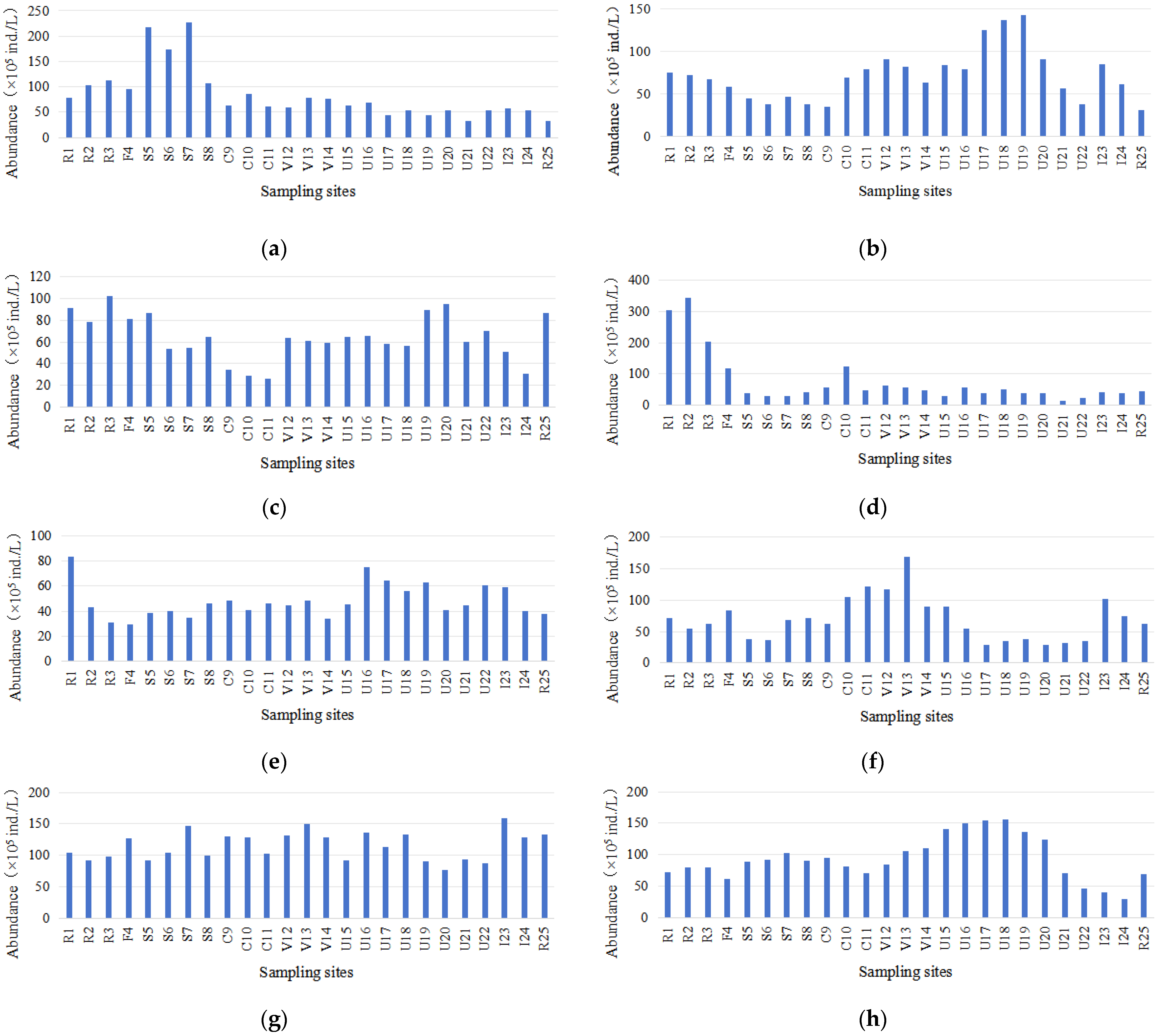 Figure 2. Temporal and spatial distributions of phytoplankton abundance in the Majiagou River. (a) May 2022, (b) May 2024, (c) July 2022, (d) July 2024, (e) September 2022, (f) September 2024, (g) Ice Formation Period, (h) Thawing Period.
