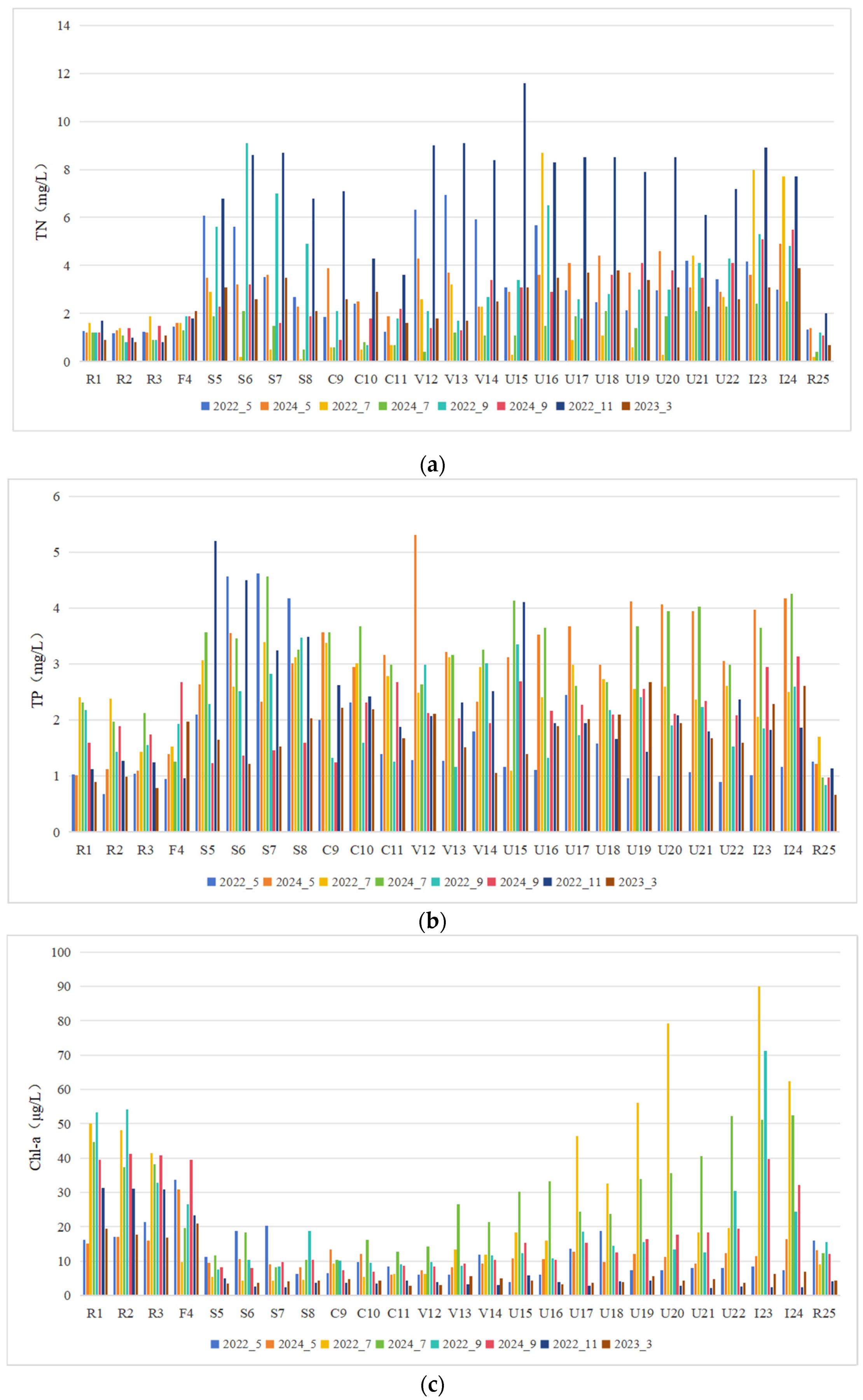 The analysis revealed significant spatial variations in TN, TP, and Chl-a concentrations across all sampling sites (p < 0.01, Figure 3). TN concentrations ranged from 0.1 to 11.6 mg/L (mean: 3.11 mg/L), with the maximum (11.6 mg/L) recorded at site U15 in November 2022 and the minimum (0.1 mg/L) at site S8 in July 2022. Similarly, TP concentrations varied between 0.66 and 5.31 mg/L (mean: 2.31 mg/L), peaking at site V12 in May 2024 (5.31 mg/L) and reaching the lowest level at site R25 in March 2023 (0.66 mg/L). Chlorophyll-a (Chl-a) concentrations exhibited the widest range (2.03–90.08 μg/L, mean: 16.33 μg/L), with the highest value (90.08 μg/L) observed at site I23 in July 2022 and the lowest (2.03 μg/L) at site U21 in November 2022.
