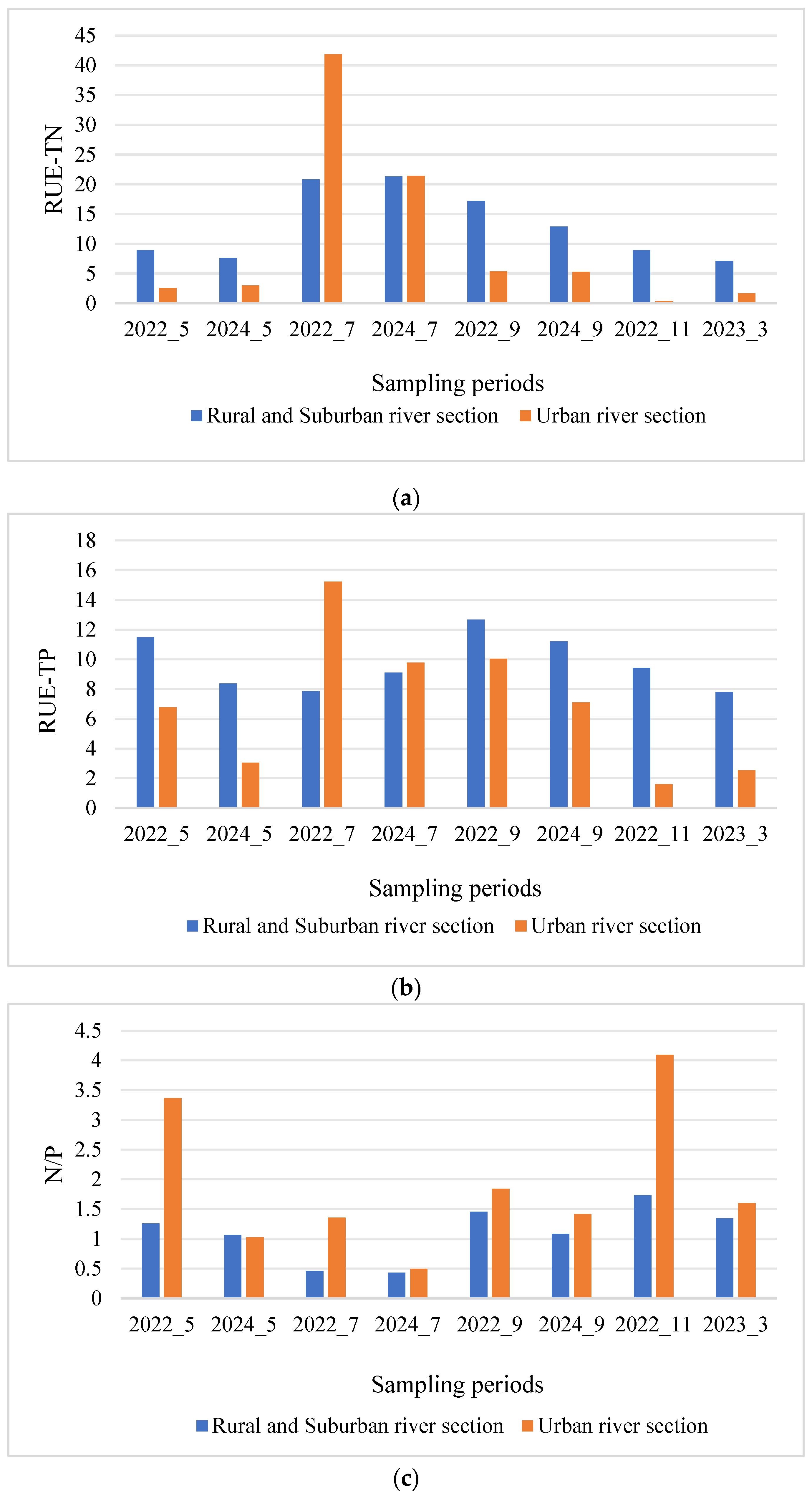 Figure 5. TN and TP resource utilization efficiency and N/P in two types of river sections of the Majiagou River during different periods: (a) RUE-TN, (b) RUE-TP, (c) N/P.