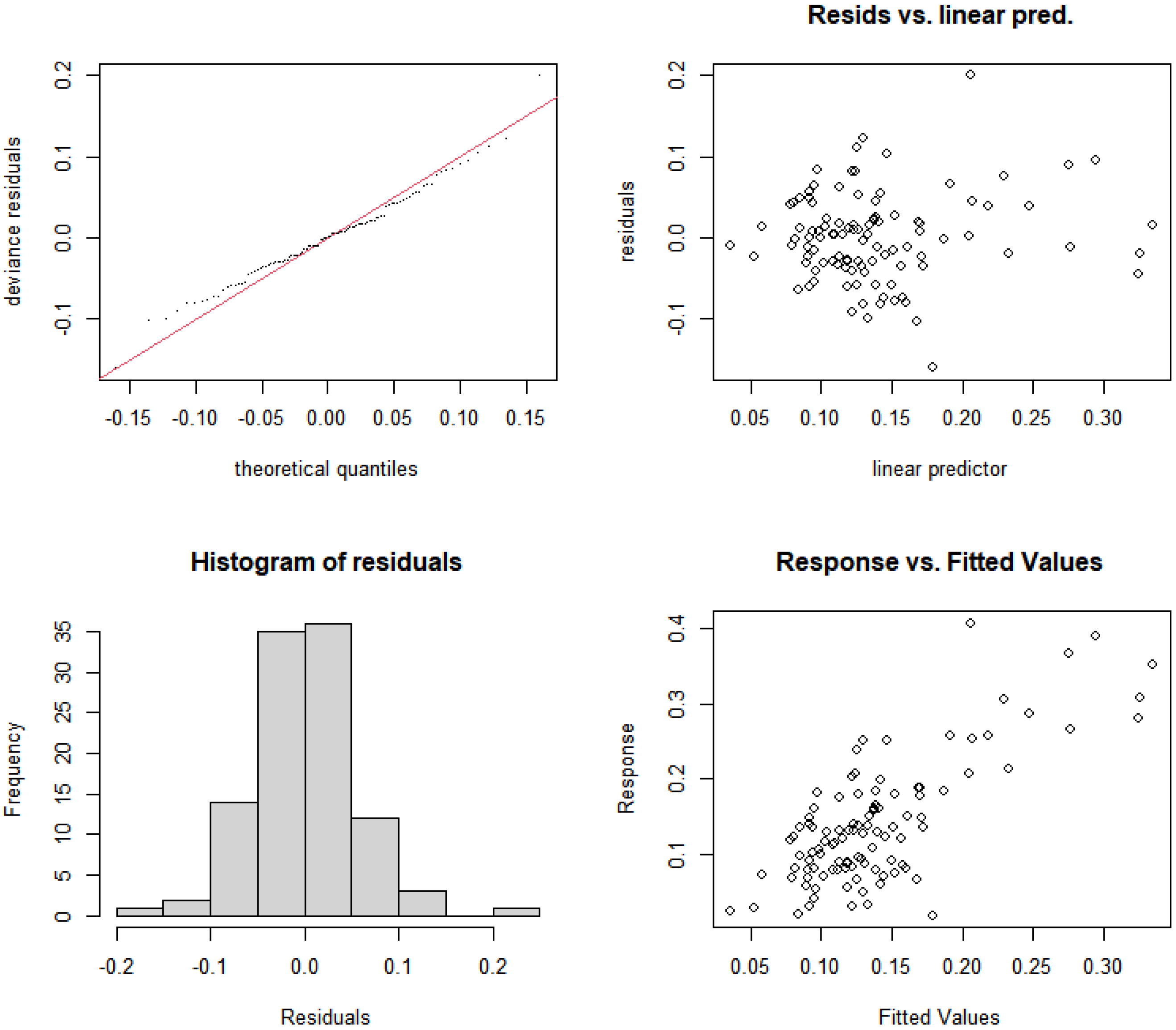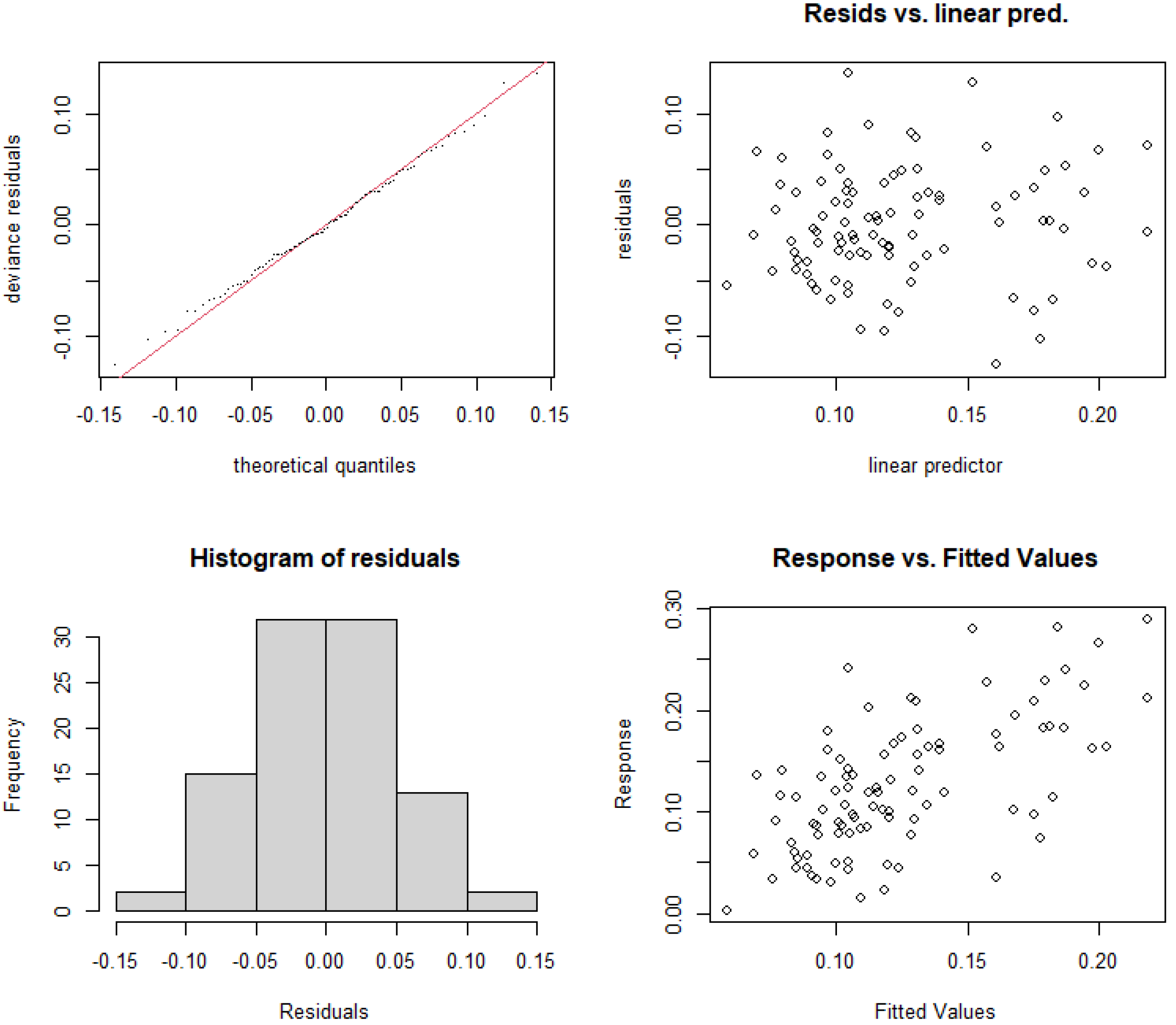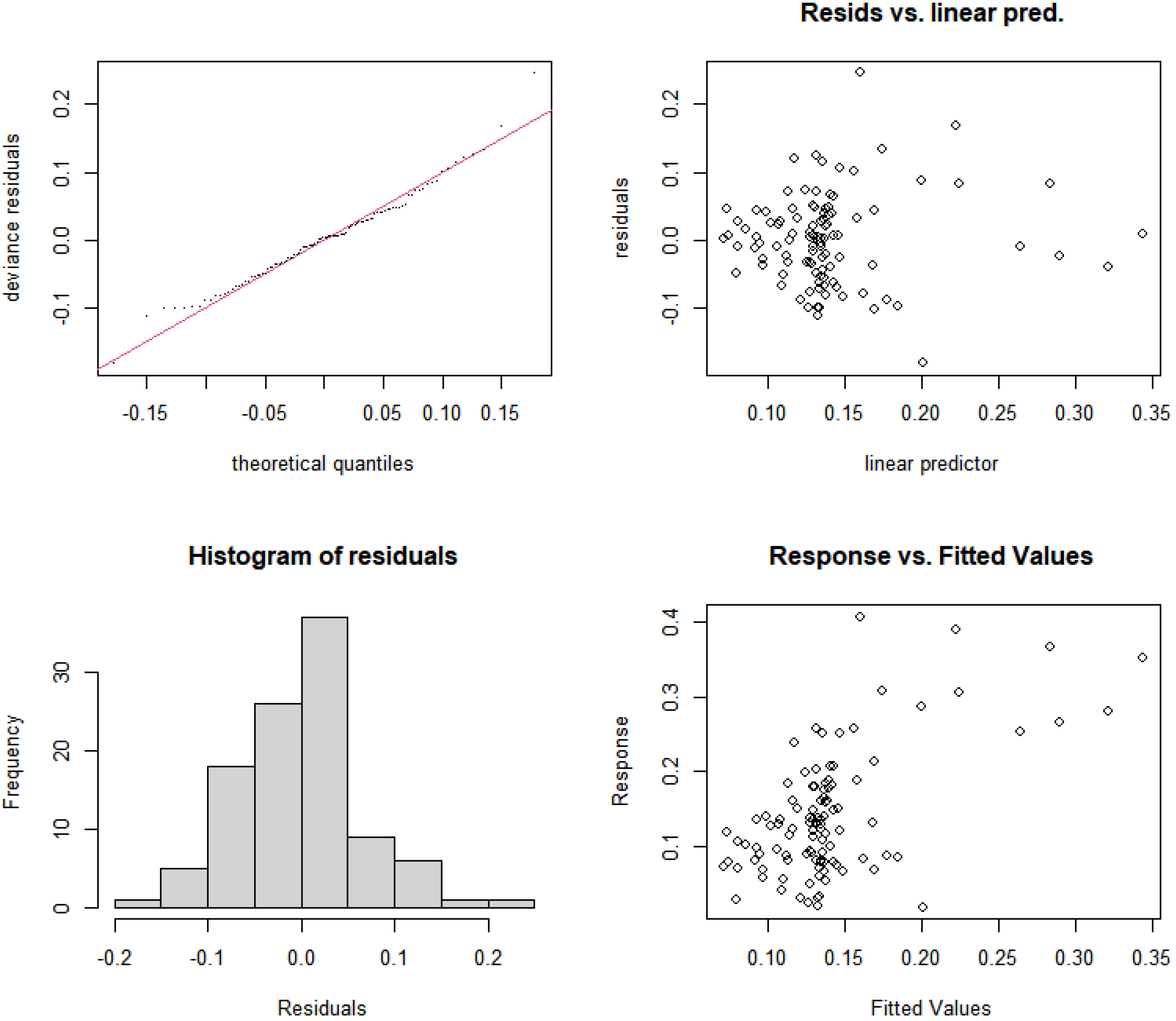 Figure 6. Residual analysis of the nonlinear model structure for relative abundance of cyanobacteria and RUE_TN with interaction terms added (Model 6).