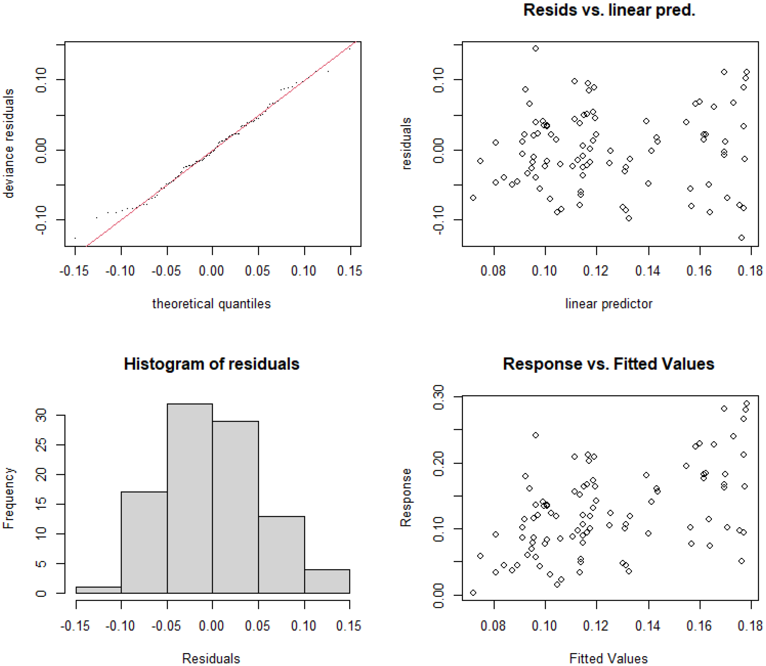 Figure 9. Residual analysis of the nonlinear model structure for relative abundance of cyanobacteria and RUE_TN with interaction terms added (Model 6).