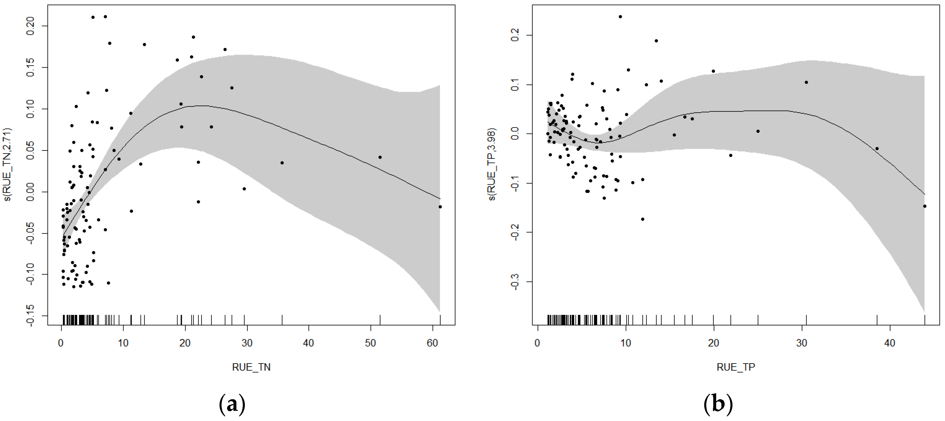 The GAM results revealed that cyanobacterial relative abundance exhibited distinct nonlinear responses to TN and TP resource use efficiencies. Within certain efficiency thresholds, increases in nutrient use efficiency corresponded to elevated cyanobacterial growth; however, beyond these thresholds, relative abundance gradually declined. This indicates that cyanobacterial dominance depends not only on the absolute concentrations of nutrients but also on the utilization capabilities of phytoplankton for these nutrients. In particular, in urban river sections, nutrient oversupply and eutrophication often coincide with reduced phytoplankton utilization efficiency, creating favorable conditions for rapid cyanobacterial proliferation and increasing the risk of bloom outbreaks.