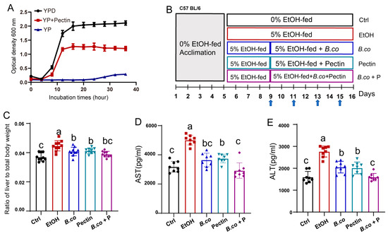 Treatment effect of B. coagulans, pectin and the synbiotic on ethanol-induced ALD mice. (A) Growth curves of B. coagulans in YPD, medium with pectin as carbon source (YP + Pectin) and medium without carbon source (YP). (B) Schematic representation of the ethanol-induced ALD mouse model utilized in this study. Arrows denote intragastric administration of phosphate-buffered saline (PBS) or B. coagulans treatments. (C) Ratio of liver weight to body weight. (D) Serum AST level. (E) Serum ALT level. Data are presented as means ± SEM. Values with distinct superscript letters (a, b and c) indicate significant differences (p < 0.05) as determined by one-way ANOVA followed by Tukey’s test. Ctrl: healthy control group; EtOH: ethanol-induced group; B. co: supplementation of B. coagulans group; Pectin: supplementation of pectin group; B. co + P: supplementation of B. coagulans and pectin group.