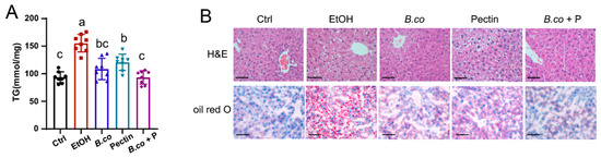 B. coagulans, pectin and the synbiotic reduced histological damage on ethanol-induced ALD mice. (A) Liver triglyceride concentration. (B) Histological assessment of steatosis in liver sections, with representative micrographs of H&E staining (top) and Oil Red O staining (bottom). Scale bars = 50 μm. Data are presented as means ± SEM. Values with distinct superscript letters (a, b and c) indicate significant differences (p < 0.05) as determined by one-way ANOVA followed by Tukey’s test. Ctrl: healthy control group; EtOH: ethanol-induced group; B. co: supplementation of B. coagulans group; Pectin: supplementation of pectin group; B. co + P: supplementation of B. coagulans and pectin group.