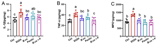 Regulatory effects of B. coagulans, pectin and their synbiotic on immune markers in ethanol-induced mice. ELISA was used to analyze the protein levels of hepatic cytokines, including (A) IL-1β, (B) TNF-α and (C) MPO. Data are presented as means ± SEM. Values with distinct superscript letters (a, b and c) indicate significant differences (p < 0.05) as determined by one-way ANOVA followed by Tukey’s test. Ctrl: healthy control group; EtOH: ethanol-induced group; B. co: supplementation of B. coagulans group; Pectin: supplementation of pectin group; B. co + P: supplementation of B. coagulans and pectin group.