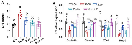 B. coagulans, pectin and their synbiotic formulation ameliorated the impaired barrier function in ethanol-induced mice. (A) Serum lipopolysaccharide levels. (B) The mRNA levels of tight junction proteins (Occludin, Claudin and ZO-1) and mucin protein Muc2 were detected by RT-qPCR analysis in colon. Data are presented as means ± SEM. Values with distinct superscript letters (a, b and c) indicate significant differences (p < 0.05) as determined by one-way ANOVA followed by Tukey’s test. Ctrl: healthy control group; EtOH: ethanol-induced group; B. co: supplementation of B. coagulans group; Pectin: supplementation of pectin group; B. co + P: supplementation of B. coagulans and pectin group.