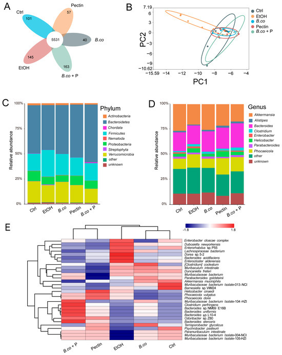 B. coagulans, pectin and the synbiotic regulated the composition of gut microbiota. (A) Venn diagram representing the common species between all five group. (B) Principal Components analysis of Bray–Curtis dissimilarities between all five group. (C) Fecal bacterial relative abundance at the phylum level. (D) The relative abundance of fecal bacterial in genus. (E) The heatmap of different species for B. coagulans, pectin and the synbiotic group. (n = 6 per group); Ctrl: healthy control group; EtOH: ethanol-induced group; B. co: supplementation of B. coagulans group; Pectin: supplementation of pectin group; B. co + P: supplementation of B. coagulans and pectin group.