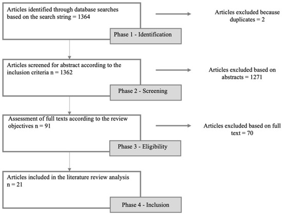 The literature search yielded 1364 articles based on the search string. After removing duplicates, 1362 abstracts were screened to determine their relevance and pertinence concerning the research questions. Subsequently, 91 full-text articles were carefully assessed for eligibility based on the inclusion and exclusion criteria. Finally, 21 articles met all the criteria and were included in the rapid review (Figure 1). The theme of the included articles focused on risk maps of diseases affecting animals, both transmissible and non-transmissible to humans, as well as potential environmental disasters.