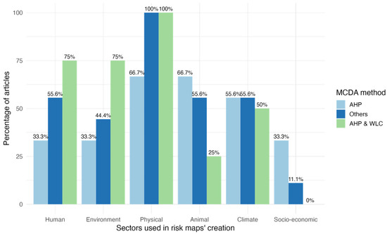 It was found that 38% (8 out of 21 articles) were dedicated to risk mapping. These articles encompassed various topics: 13 focused on communicable diseases, 2 focused on vectors, 4 focused on natural disasters, and 2 focused on environmental factors. A total of nine articles used a single MCDA method; six used AHP; one used WLC; one used Fuzzy Logic; and another used Simple Additive Expression. Notably, 13 articles employed a combination of methods to create risk maps, with AHP and WLC being the most frequently combined techniques. The literature review also revealed that several criterion types were employed, including domains such as human, animal, vector, ecological, socioeconomic, physical, and climate factors. In Table 1, the list of criteria used in each respective sector is provided.