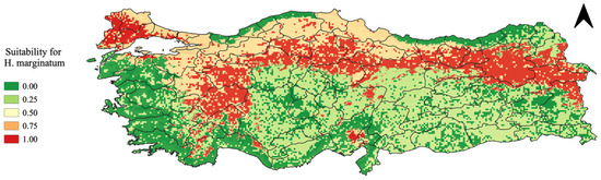 As shown, the northern part of Türkiye exhibits a notably high risk for the presence of H. marginatum, with values near 1. This risk corresponds to areas where the environmental conditions are highly conducive to H. marginatum. Conversely, the central-southern regions of Türkiye are depicted as low-risk areas, with values near 0. These regions do not align with the tick’s preferred environmental conditions due to factors such as less suitable temperatures and reduced vegetation cover.