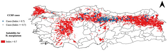 We overlaid human CCHF disease presence points onto the MCDA output to analyze the spatial relationship between tick presence and human disease cases (Figure 5). Figure 6 highlights regions in red where the probability of encountering H. marginatum ticks exceeds 70%. This image aids in understanding the correlation between the high probability of tick presence and the occurrence of human CCHF cases, showing how many of these infections fall within areas where the likelihood of encountering H. marginatum is greater than 0.7.