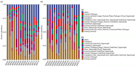 Relative abundance of functional guilds in the rhizosphere fungal communities of the (a) Shenbaotang and (b) Sanjiaohutang sites. Note: SBT01 to SBT15 and SJHT01 to SJHT15 represent samples from the rhizosphere of 15 plants analyzed at the two sites, the Shenbaotang (SBT) and Sanjiaohutang sites (SJHT).