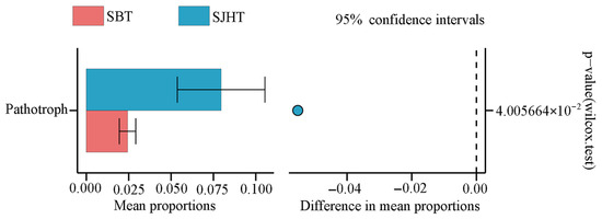 A Wilcoxon test indicated that the relative abundance of the Pathotroph trophic mode was significantly higher at the SJHT site compared to the SBT (p < 0.05; Figure 2). Conversely, several functional guilds, including Bryophyte Parasite-Dung Saprotroph-Ectomycorrhizal-Fungal Parasite-Leaf Saprotroph-Plant Parasite-Undefined Saprotroph-Wood Saprotroph, Dung Saprotroph-Plant Saprotroph-Wood Saprotroph, Ectomycorrhizal-Lichen Parasite-Lichenized-Plant Pathogen, Endomycorrhizal-Plant Pathogen-Undefined Saprotroph, NULL, and Plant Parasite-Wood Saprotroph, were significantly more frequent at the SBT site than in the SJHT (p < 0.05). Additionally, the fungal functional guilds of SJHT exhibited significantly higher relative abundances of Animal Pathogen, Arbuscular Mycorrhizal, Dung Saprotroph, Ectomycorrhizal-Undefined Saprotroph-Wood Saprotroph, and Plant Saprotroph than those of SBT (p < 0.05; Table 3).